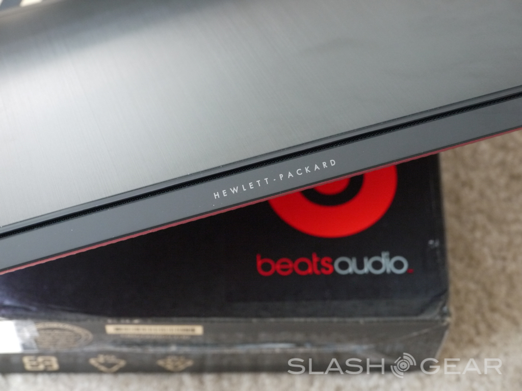 The top has that midnight black brushed aluminum look and the only change is the neat and small HP logo on the bottom corner. As you curve around the sides to the ports however, you'll quickly notice the aluminum design ends for a soft-touch red matte texture instead. This makes it easy to hold, but causes an area that may separate in the future if it takes too much abuse. The entire sides and bottom are bright "Beats Audio red" and is soft to the touch. This makes it easy to hold, and comfortable to carry.