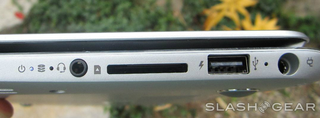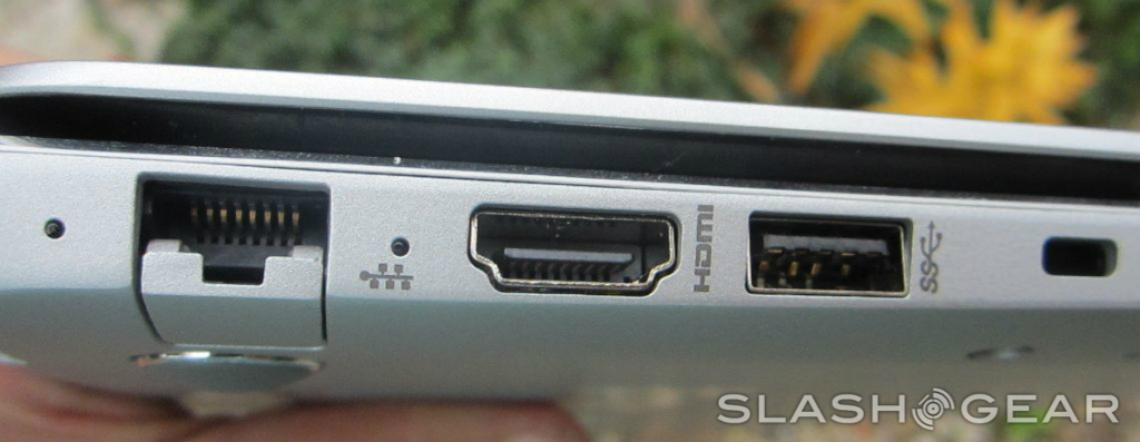 On the outside, we have a pretty minimalistic look. On the right side of the device, the power jack, a USB 3.0 port, an SD card slot, and a headphone jack have taken up residence, while the Ethernet port, full-sized HDMI port, and another USB 3.0 port are found on the left side. The Ethernet port features a hinge that keeps the port flush with the rest of the machine when there isn't a cable attached, which is a really nice touch – too often, we have the look of these sleek ultrabooks ruined by an ugly square Ethernet port that doesn't really fit with the overall design. There isn't anything really noteworthy on the bottom of the machine aside from a pair of speakers (more on those later) and grills for air intake and cooling.