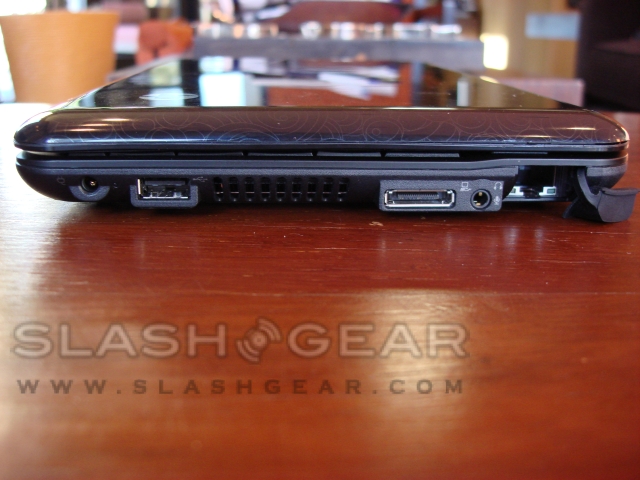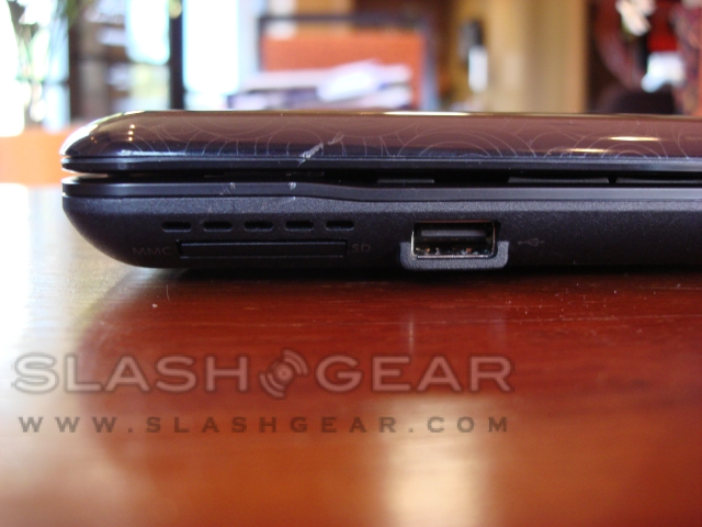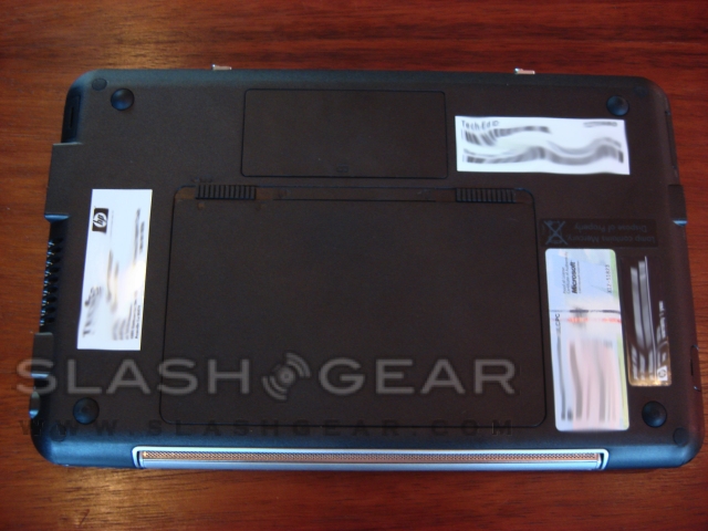 On the left side of the HP Mini 1000 you will come across a DC power supply port, 2.0 USB, a small fan exhaust port, proprietary dongle port if you want to shoot out video to VGA, shared 3.5mm headphone /microphone jack and under a rubber cover you will find a 10/100 Ethernet jack for wired connection. HP has included a rubber cork to cover the Ethernet port because the HP Mini is meant to be more portable with the use of Wi-Fi. The single fan port does allow the notebook to get rather hot just under the track pad, there should be more ports for ventilation. Along the right side you will find a microSD card reader and a second 2.0 USB port.