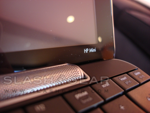 As to be expected with such a small notebook, there is not much room for the touch pad, the only issue we saw here was the position in which it was placed. Being offset to the left a little bit made our hands rest upon the left button. Other than that the touch pad is very smooth making navigating easy no matter what you are use to. The glossy screen adds to the overall look of the Mini 1000, but does add a glair to the display. It looks like HP has continued to follow the overall look of their laptops by adding the silver swirl design to the piano black finish.