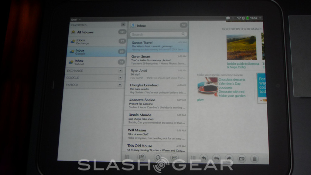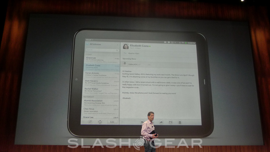 Email now gets a multi-pane UI, showing the inbox at the same time as a message for instance, and allows for multiple selections and local content search. Contacts, too, has been updated with HP's new super-scrolling feature, while the calendar – which still uses Synergy to pull in information from Exchange, Google Calendar and other sources – now allows for multiple calendars to be shown at any one time.