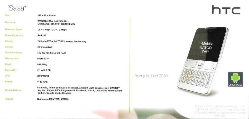 HTC have two handsets in this category, the HTC Legend – described as the successor to the HTC Hero – which is just 11.4mm thick, drops the trackball in favor of an optical mouse, and is set to arrive in March 2010, and the HTC Salsa. The Salsa is a new form-factor for HTC's Android devices, being an 8.6mm thick candybar with full QWERTY keyboard; it's set to arrive in June 2010.