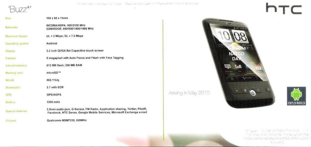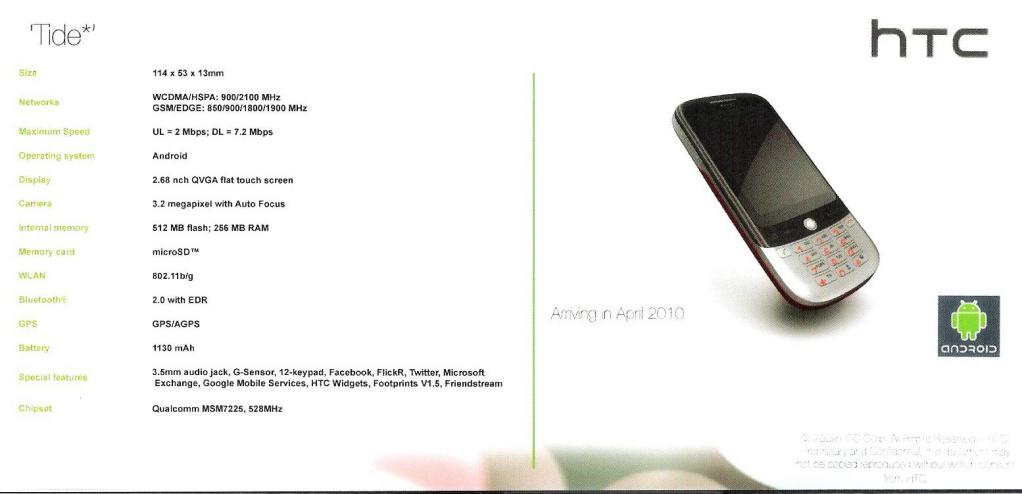 The HTC Tide will arrive in April 2010, and look more like a traditional cellphone with a touchscreen above a regular numeric keypad; meanwhile the HTC Buzz uses replaceable covers, similar to the HTC Tattoo, but in a larger device with a 3.2-inch display and 5-megapixel camera. The Tide and Buzz will arrive in April and May 2010, respectively.