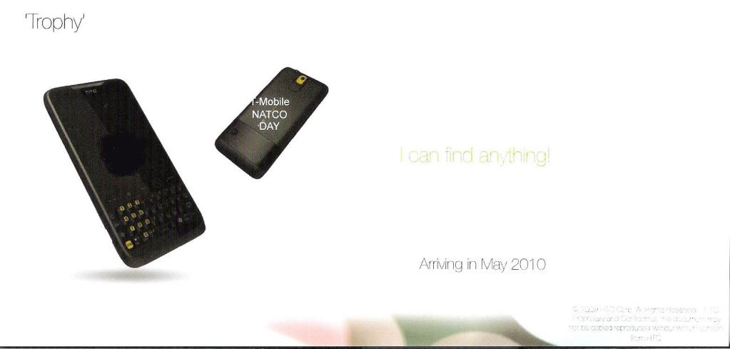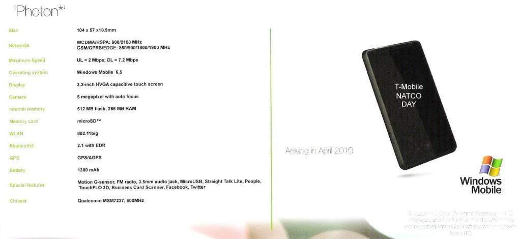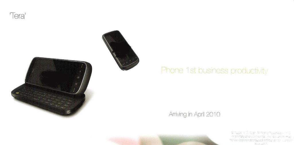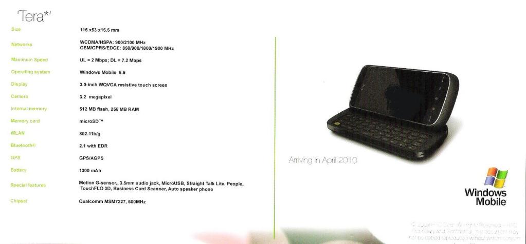 Three Windows Mobile 6.5 handsets occupy this category, the HTC Photon, HTC Trophy and HTC Tera, apparently set to launch in April, May and April 2010 respectively. The Photon has a 3.2-inch HVGA touchscreen, 5-megapixel camera and 600MHz Snapdragon processor, while the Trophy is a QWERTY candybar with a slightly smaller 3-inch VGA display and the same 5-megapixel camera. Finally the HTC Tero has a Touch Pro2 form-factor with a slide/tilt touchscreen revealing a QWERTY keyboard and a 3.2-megapixel camera on the back.