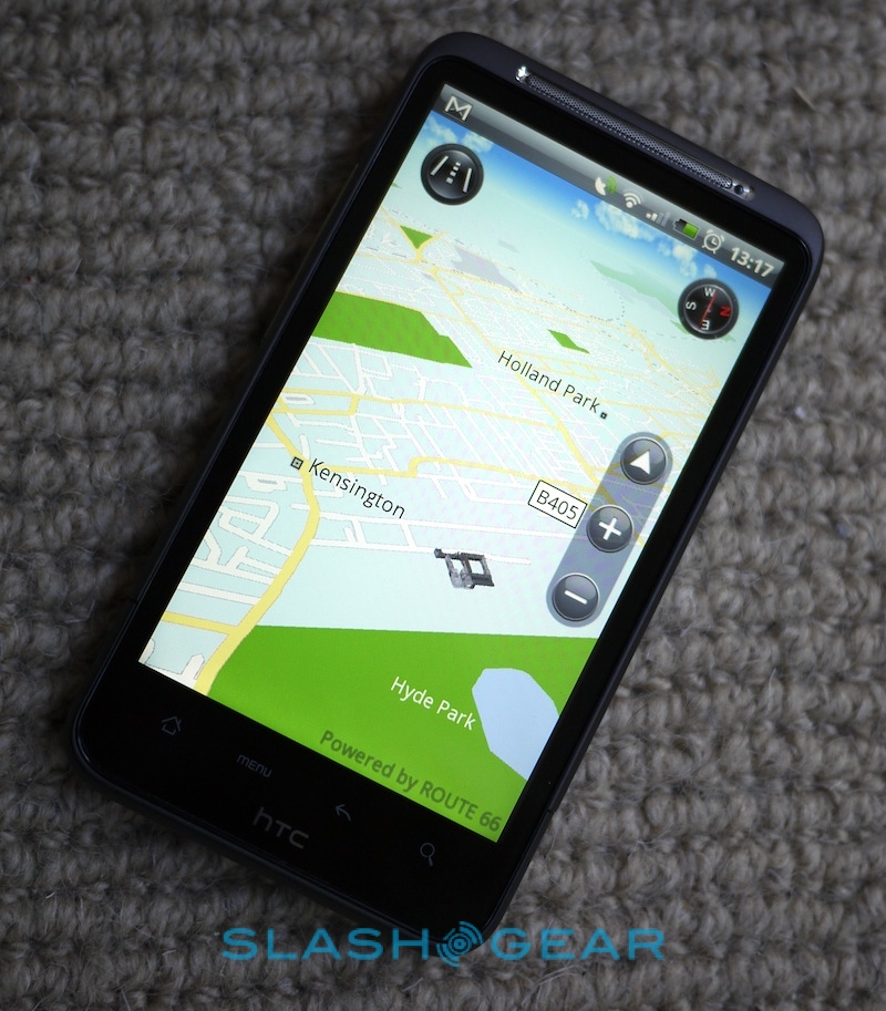 That's because, rather than integrate with Google Maps, HTC's version uses Route 66's navigation software. There's an option to "Integrated Google Navigation" with HTC Locations, but all that does is add the option to view a POI on Google Maps rather than, by default, Route 66 maps. UK and Ireland navigation is $5.99 for 30 days, $24.98 for a year, or $37.99 for the lifetime of the device; if you then want US navigation you'll have to pay again: $4.99 for 30 days, $19.98 for a year or $29.98 for lifetime service. The maps themselves look good, and offer regular 2D or birds-eye perspectives, but we can't see many people paying for service when Google Maps Navigation is so strong. It's also worth noting that Nokia offers free, locally-cached mapping as part of their Ovi Maps app, complete with free navigation.