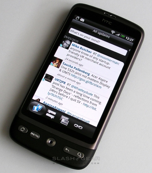 Even with all seven panes stuffed full of widgets, shortcuts and the rest, the Desire's 1GHz Snapdragon processor never feels stressed. In fact, the homescreen whips from side to side with no delay, Live View is instantaneous and we noticed all of the data-heavy widgets seemed to update a little quicker than on previous handsets. When you first boot up the Desire, HTC ask for Facebook, Twitter and Flickr login details (as well as any POP, IMAP or Exchange email credentials you may want to use), and then the phone pulls in the latest updates together with contacts and calendar entries.