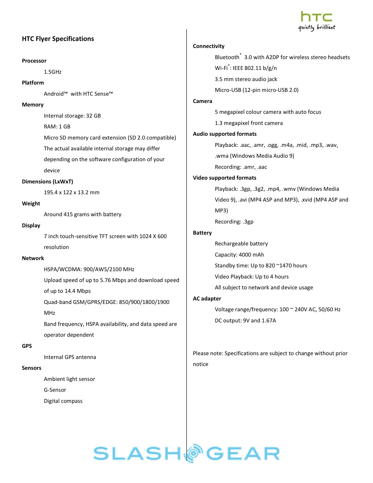 Encased in a sleek aluminum unibody, the HTC Flyer tablet exudes the iconic style and build quality HTC is known for. It is also ultra-light, weighing as little as a paperback book, and compact enough to fit in a jacket pocket only. With a seven-inch display, lightning fast 1.5Ghz processor and high-speed HSPA+ wireless capabilities, the HTC Flyer tablet is perfect for those who have been waiting for a tablet that is both compact and powerful.