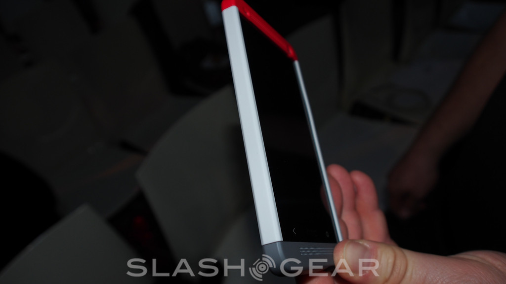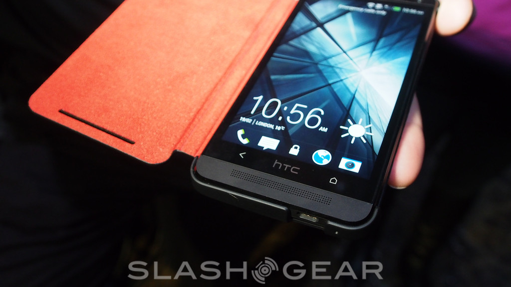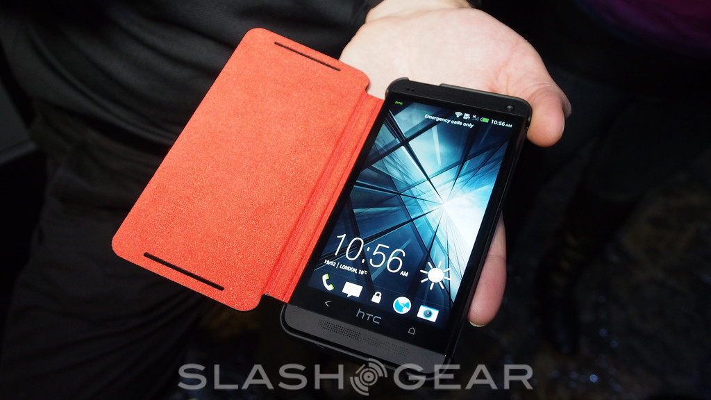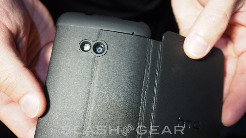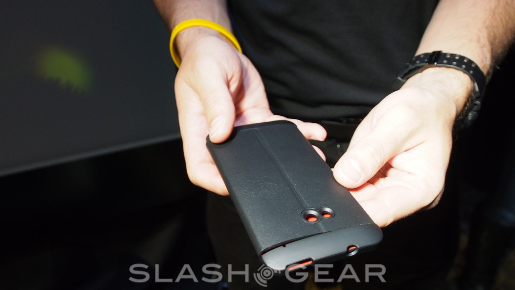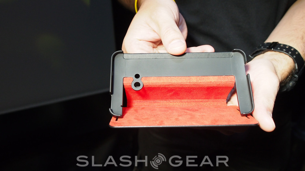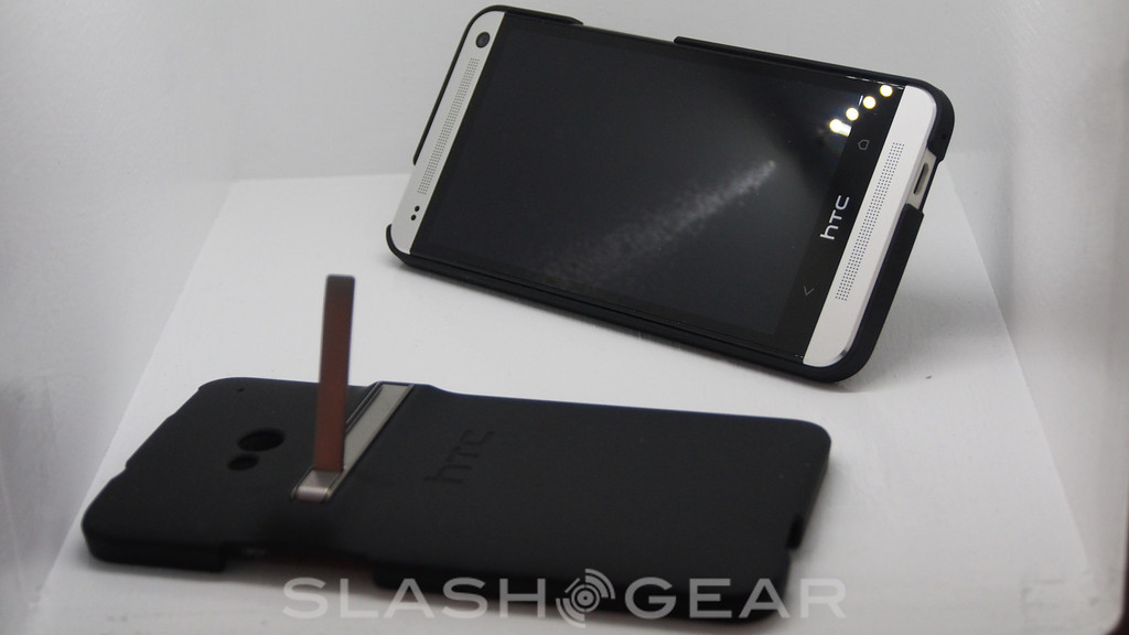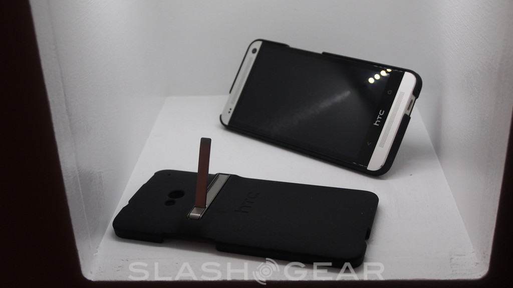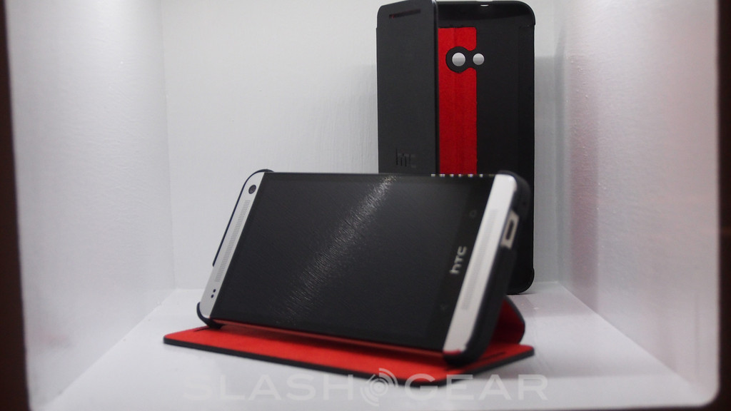 The kickstand case you're seeing here takes on a form not unlike what we saw with the HTC One "EVO" device we experienced earlier last year – have a peek at our HTC EVO 4G LTE New Orleans ImageChip Tour post for more information on that HTC kickstand-lover. The fold-over case you see here employs red and black on its insides, leading us to believe that a Verizon version of the HTC One might be on the way – DROID perhaps.