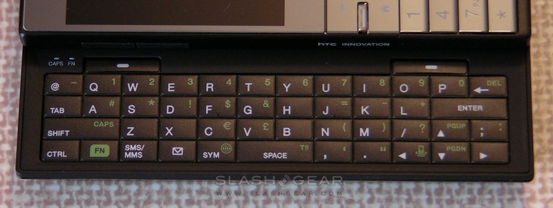 A little pressure to the right, and the top panel slides across with a solid, spring-loaded click to reveal the QWERTY keyboard. The buttons are all 8 x 5mm (with the exception of the space, left-shift, enter and two soft-keys, which are double-width) and slightly domed, with white and green backlit text. Two small green LEDs on the top left indicate Fn and Caps-lock status. As well as the standard alphanumerics (with number keys sharing the top row of the QWERTY 'board, and accessed via the Fn modifier), there are shortcut buttons to SMS/MMS, Email, internet and the communications manager.