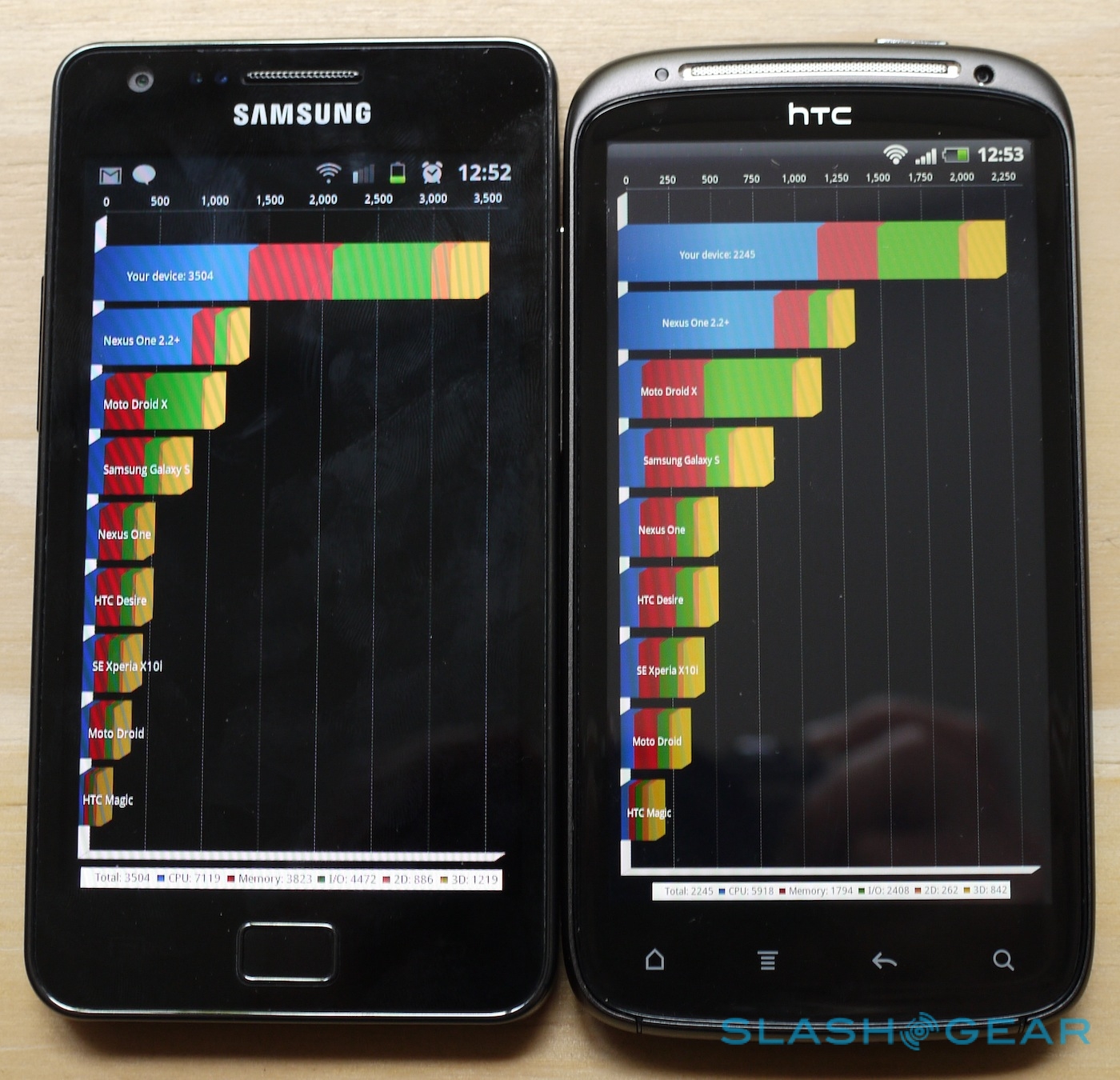 We had high hopes for the dual-core 1.2GHz processor, but the benchmarks paint a less impressive picture than on the Galaxy S II. In Quadrant Advanced, the Sensation scored 2245 overall versus the Samsung's 3504. Memory and I/O sub-scores were also telling, with the HTC managing 1794 and 2408 respectively, while the GSII came in at 3823 and 4472 respectively; that suggests that the Samsung will handle heavier loads and more frequent data reads/writes better than the Sensation can.