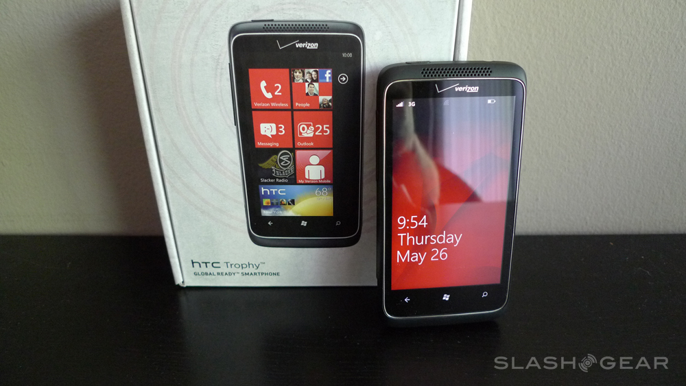 We've just received a package in the mail from none other than the rapidly-deploying mega-carrier Verizon Wireless, a box containing no less than the Windows Phone 7 device called HTC Trophy. This is a device that is still indeed running on Windows Phone version 7, (as opposed to Mango,) is rolling out with a WVGA 3.8-inch touchscreen, has a 5-megapixel camera on the back, and is running on a 1GHz Snapdragon processor. This device is one of HTC's newest and, compared to the other line of phones they've been putting out for the past few months [Android specific] this device is rather small in comparison. But it's nice!