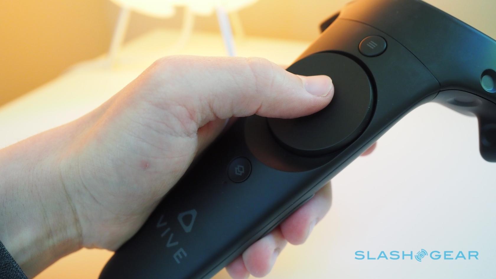Just above is a menu button, the purpose of which depends on the game or app you're using, while below is a shortcut that summons the main Vive menu within VR space. On either side, there's a lozenge-shaped button designed to activate when you squeeze.
