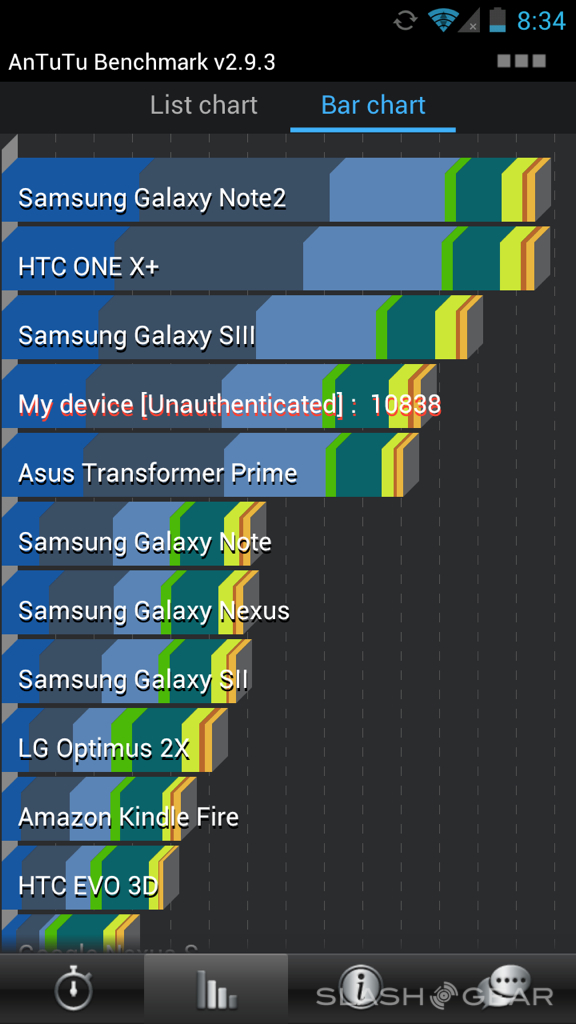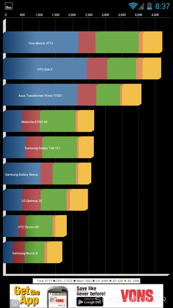 This quad-core processor appears very much to be doing quite well for itself in our initial benchmark tests, busting up Quadrant Standard with a CPU score of 11373, this just a bit less than the HTC One X and the Transformer Prime. The I/O, on the other hand, is a massive 6494, well outperforming both devices. Of course these tests don't count for everything, and we'll be letting our own hands-on everyday use decide what's best for the average consumer.