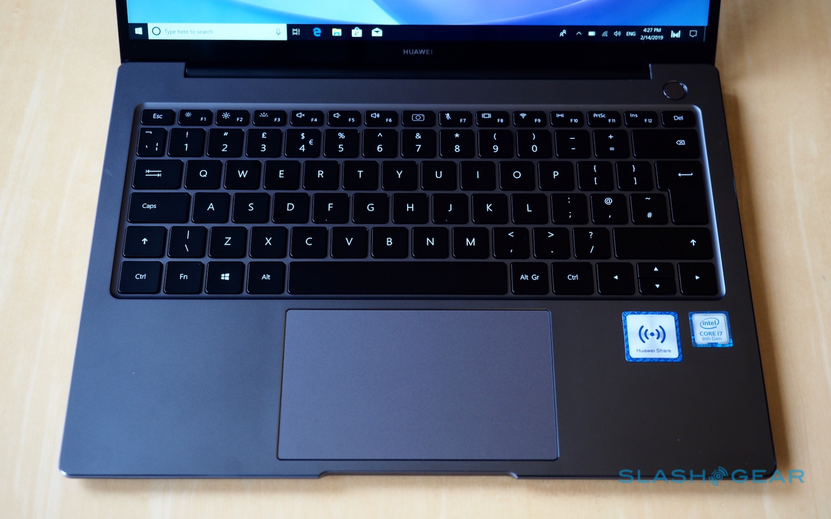 Lift the lid and you'll find Huawei's 14-inch 2K Full View display, a 2,160 x 1,440 LCD with a 90-percent screen to body ratio. It's a 3:2 aspect display – Huawei says that's more useful for office applications – with 300 nits brightness, a 1,000:1 contrast ratio, and 100-percent sRGB color gamut.