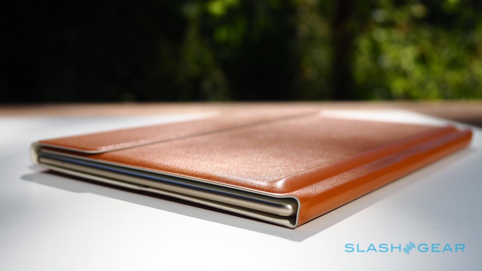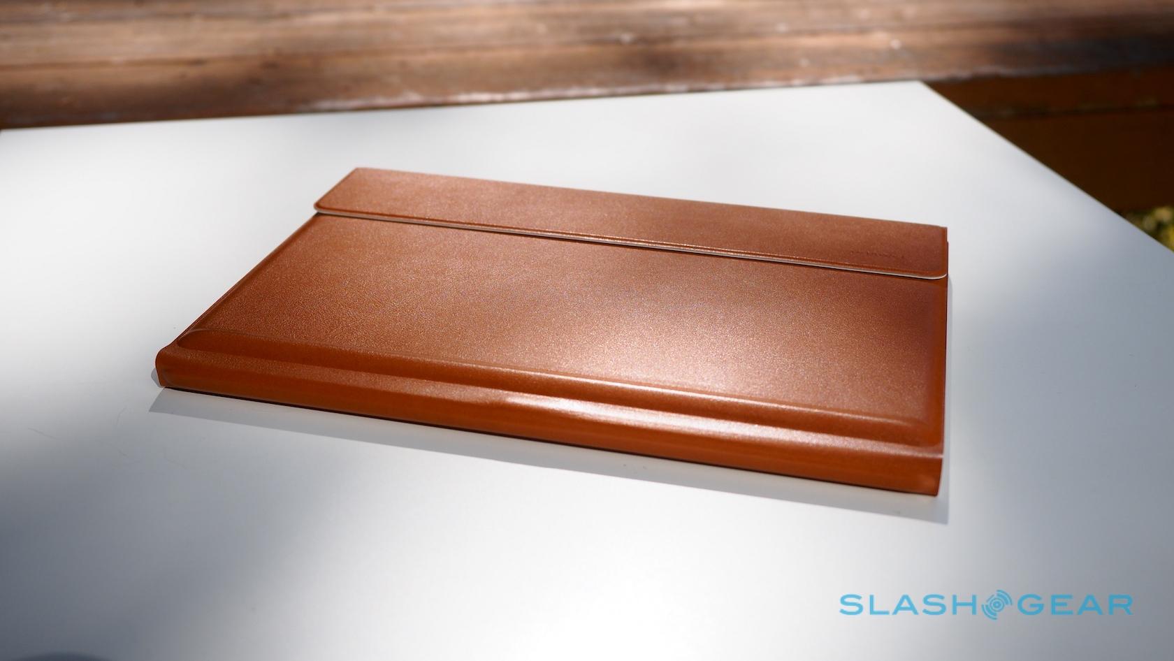 Huawei's Portfolio Keyboard for the MateBook works much in the same way that Apple's Smart Keyboard does for the iPad Pro. The tablet grabs onto the faux-leather case magnetically – it makes its connection with a row of pins, which means no using the tablet in portrait orientation – and then can be propped up at one of two angles by folding the rear into a triangle.