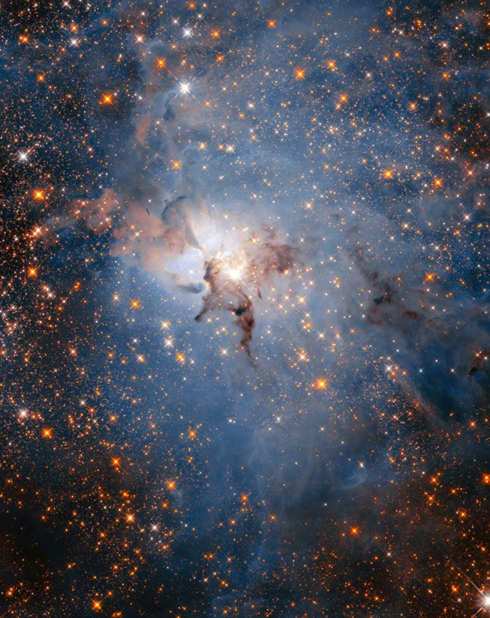 This anniversary image of the nebula shows the heart of the Lagoon Nebula. There are lots of large, hot stars in the nebula and the UV radiation from them ionizes the surrounding gas and makes it shine brightly. That radiation also turns the gas into the cloud-like shapes we can see. The large and very bright star in the center of the image is called Herschel 36.