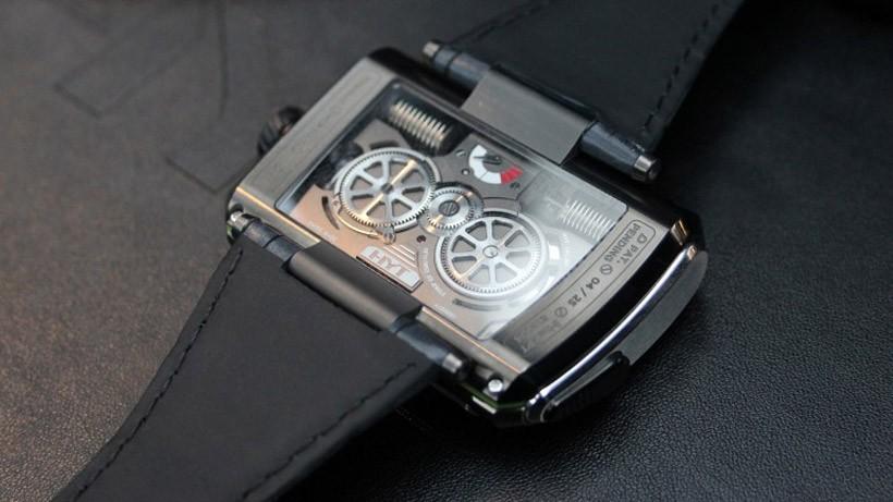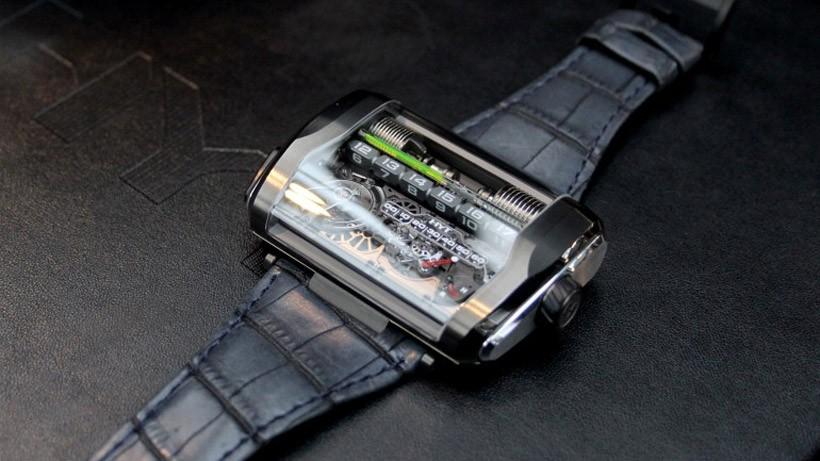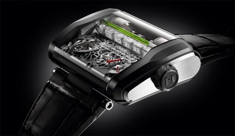 With the hydro electrical movement, a small tube of fluid counts down the time for you rather than hands. HYT offers the H3 in a rectangular version that has a straight tube counting hours and minutes. A round version of the movement is also available that has the tube of fluid arranged around a traditional circular watchface.