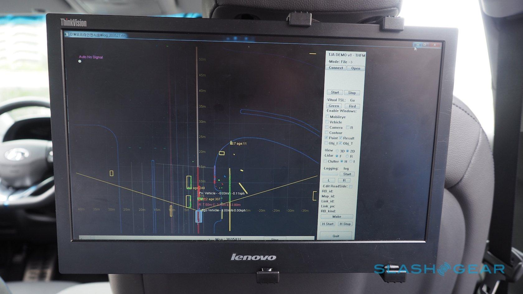 The masked technology continues inside, for the most part. Hyundai has strapped in two LCD displays for those in the rear seats to see what the computer sees. On the left, a feed from the camera array, with traffic signals boxed out when identified and a green flag for when the lights change; on the right, a top-down view of what the LIDAR and radar sensors see around the vehicle, overlaid on top of the HD Map.