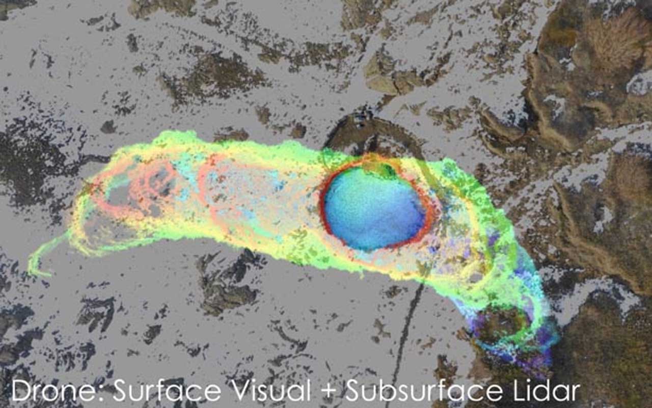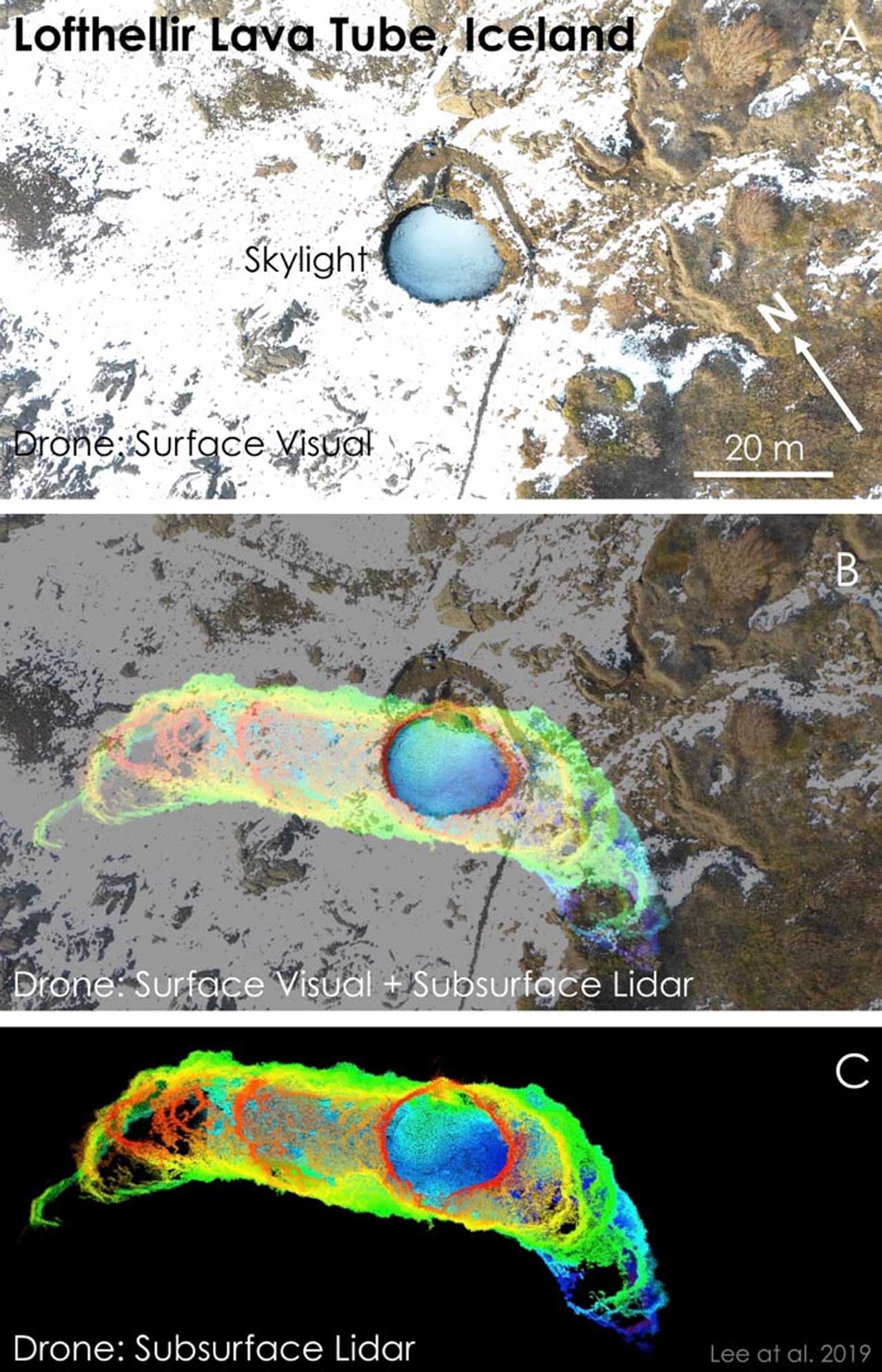 The SETI Institute and Astrobotic Technology, Inc have announced that they have finished using a drone equipped with a LiDAR system to explore the interior of a lava tube in Iceland. The ice-rich lava tube is located in the remote Myvantn region of Iceland. The LiDAR packing drone was able to document the shape and extent, history of rock falls, and ice formations inside the tube.
