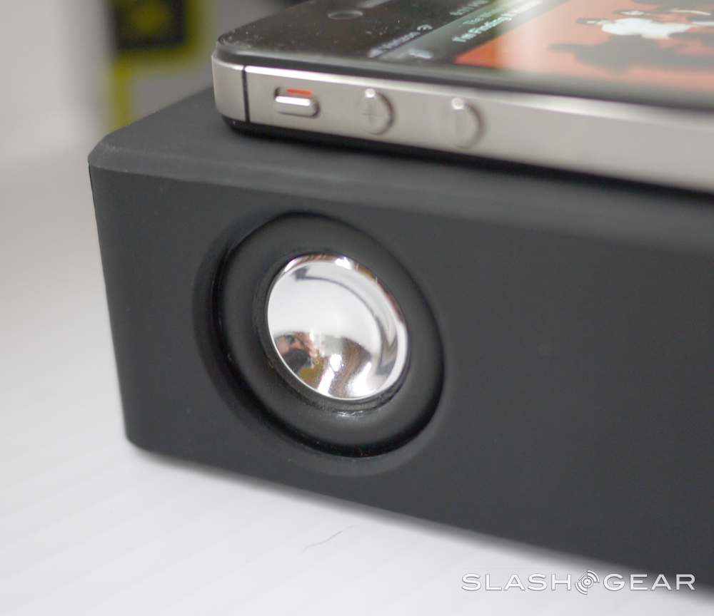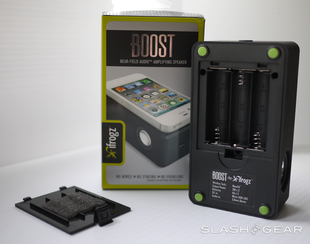 It's what's inside that counts. Inside is iFrogz implementation of NearField Audio, this allowing you to simply place your device down and have its sound amplified through the device electronically – have a peek at the hands-on video above to see what it's all about. This device is powered either by the three AA batteries you'll be placing yourself inside or by a microUSB cord you, also, will be supplying.