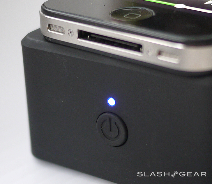 This device comes in a simple cardboard box and you get the dock only. The dock is just a bit too large to fit in your pocket, but certainly not too big to fit in your purse or backpack. It's got two relatively unprotected speakers, one on each side, with a power button on the front with a single light that'll show you the status of the device. Other than the three AA battery slot below, and the two ports in the back for auxiliary line-in and optional DC power via microUSB, there's nothing more to this device.