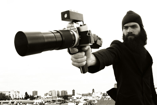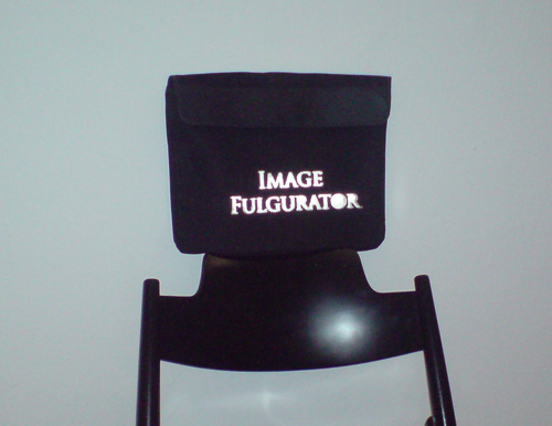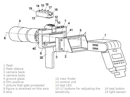 Inside the Fulgurator is a standard camera body, loaded with developed slide film. When the light sensor recognizes a photo being taken, it triggers a flash unit behind the camera, projecting the images on the film onto whatever is being photographed.