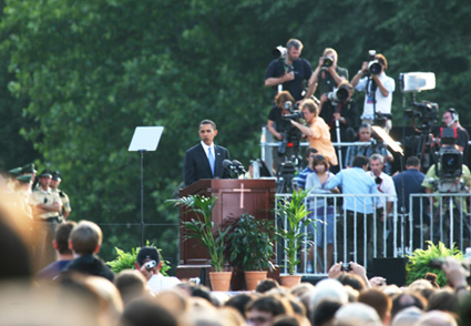 Since the projection is so quick, the human eye doesn't see it happen; the evidence only shows up on the photos themselves. Julius used the Image Fulgurator at a Barack Obama speech in Berlin, Germany; you can see the effect in the gallery below.