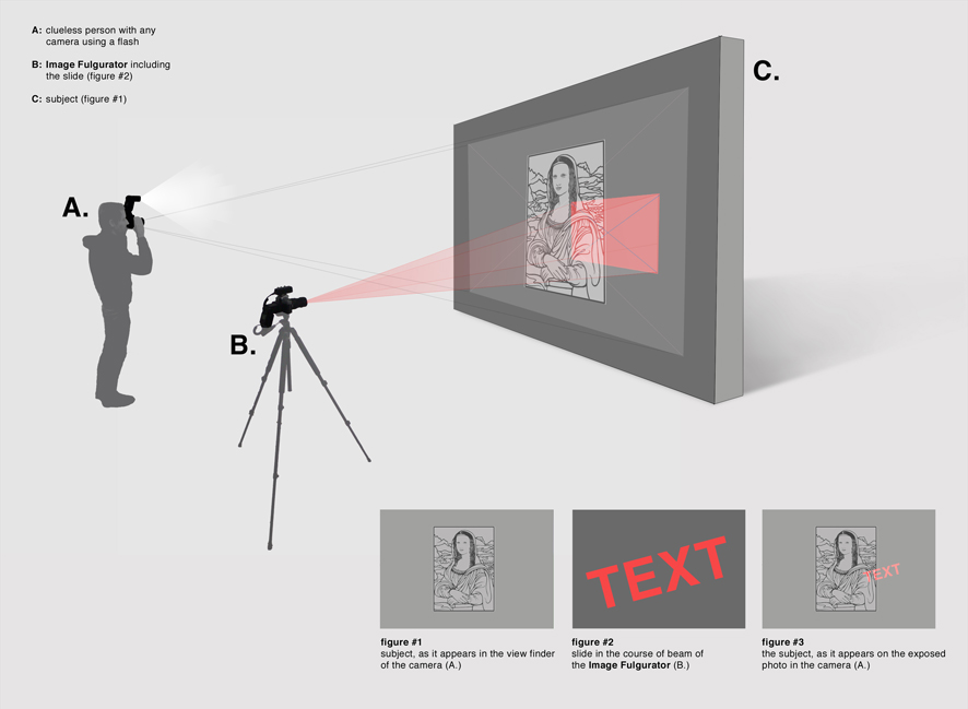"In principle, the Fulgurator can be used anywhere where there is another camera nearby that is being used with a flash. It operates via a kind of reactive flash projection that enables an image to be projected on an object exactly at the moment when someone else is photographing it. The intervention is unobtrusive because it takes only a few milliseconds. Every photo another photographer takes of an object at which the Fulgurator is also aimed is affected by the manipulation. Hence visual information can be smuggled unnoticed into the images of others" Julius von Bismarck