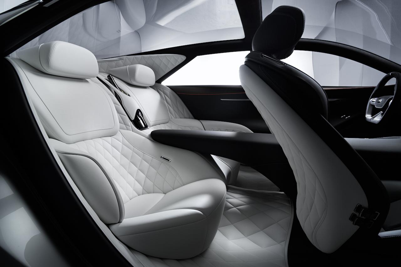 The dashboard has two head-up displays, one for the driver and a second system for the front passenger, which pulls infotainment through a paired smartphone. In the back, there are two touchscreens built into the headrests.