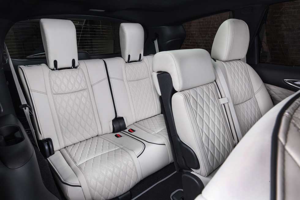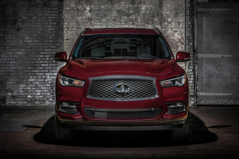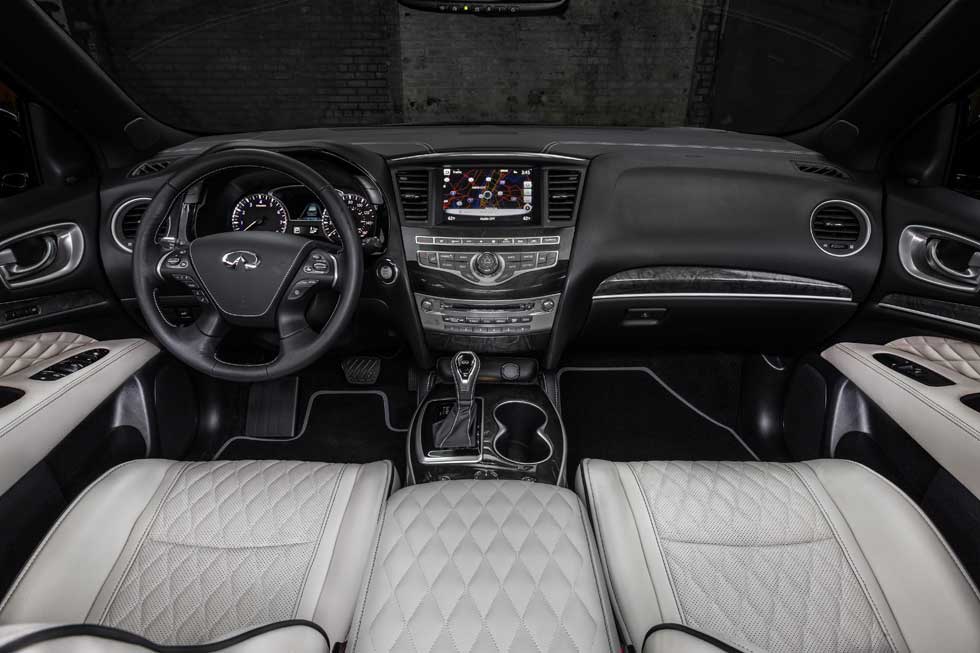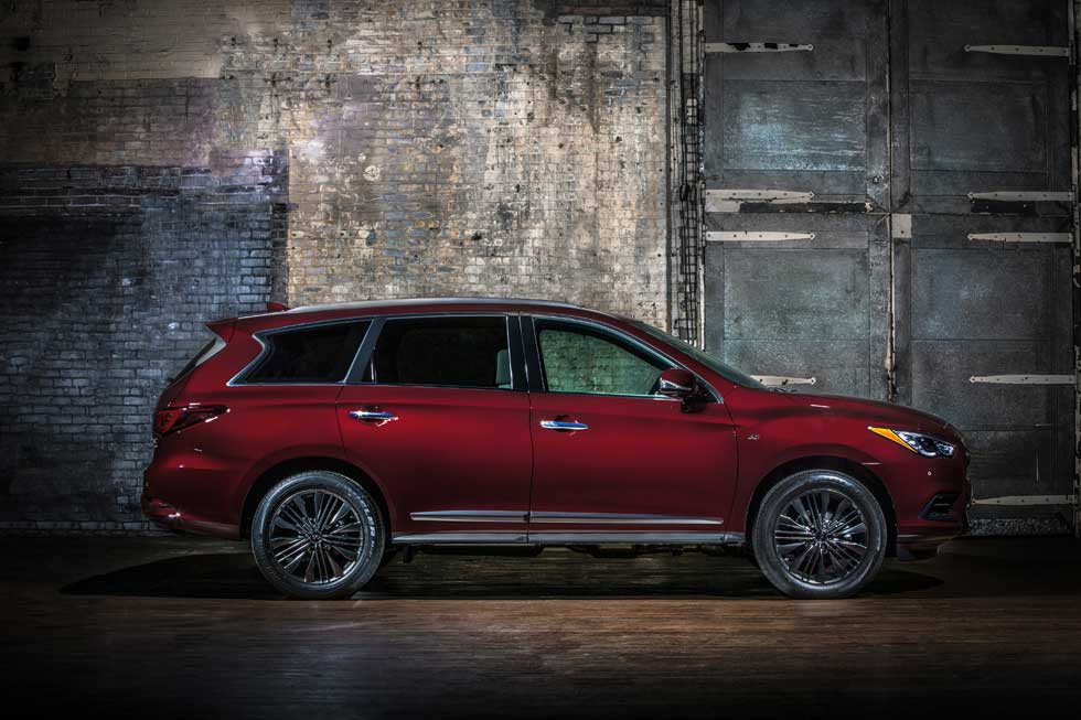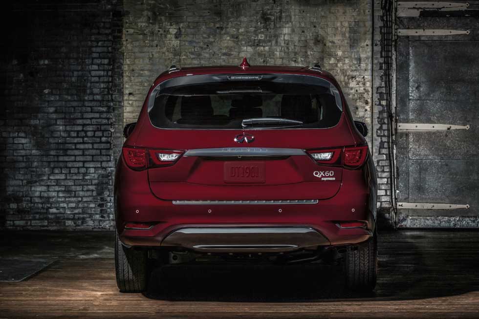 The QX60 Limited gets special dark chrome front grille, fog lamp finishers, and door moldings. Dark premium-paint roof rails and cross bars are included along with special rear bumper lower coloring with gloss black. The hatch on the vehicle gets Limited lettering and the SUV rolls on 20-inch dark aluminum-alloy wheels shod with 235/55R-20 all-season tires.