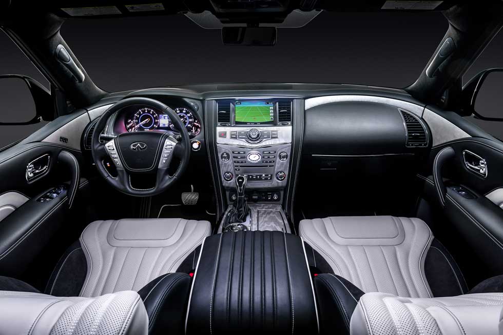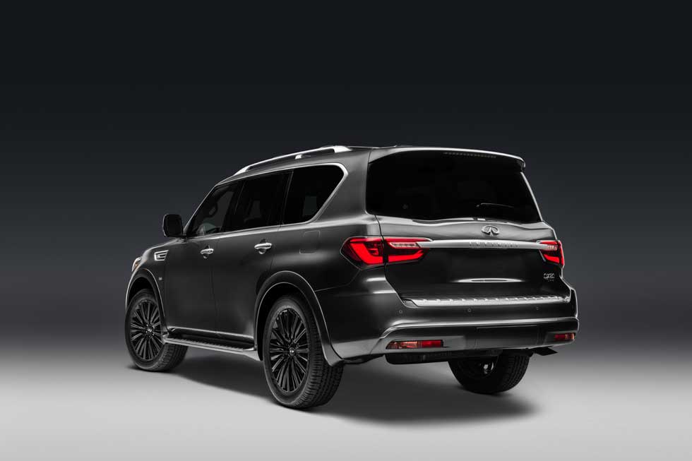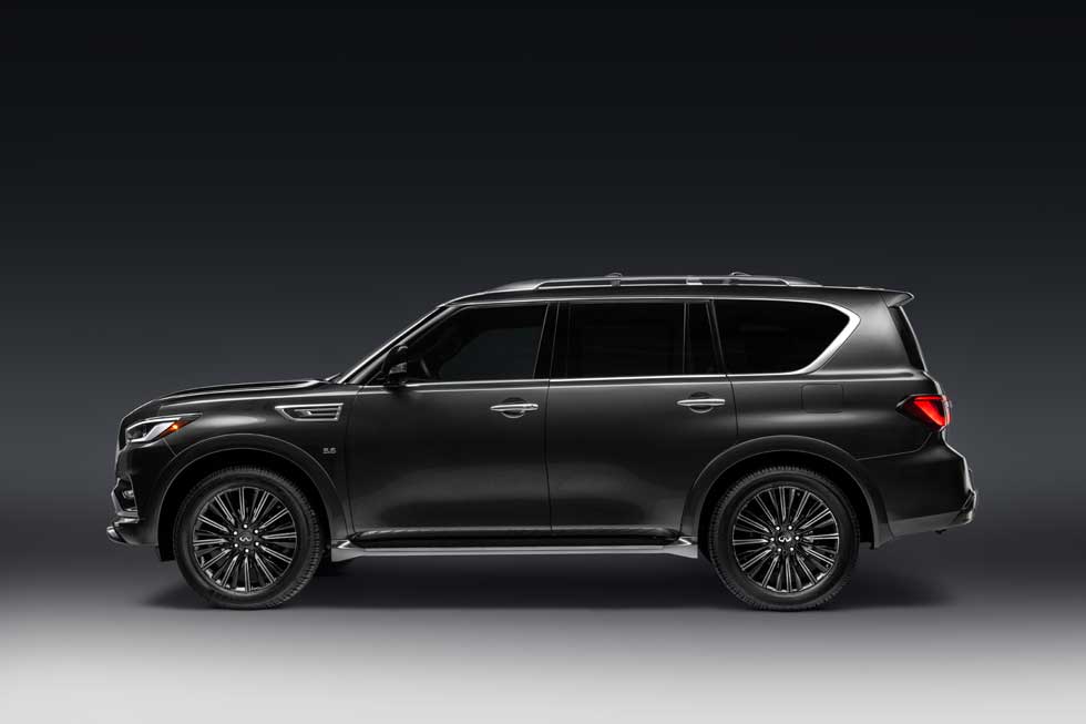 The QX80 Limited gets 22-inch dark machine-finished wheels, stainless steel running boards with rubber grips, branded welcome lighting, satin chrome exterior trim, satin chrome roof rails and crossbars. The front and rear bumpers get unique lower treatments.
