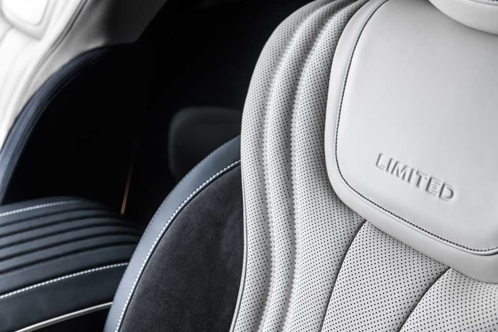 Most of the fancy materials are in the interior of the vehicle with contrasting stitching, leather wrapped grab handles, dark Silverwood accents, and black headliner and pillars. The seats are stone colored semi-aniline leather for all three rows with quilting, perforation, and contrasting stitching and piping.