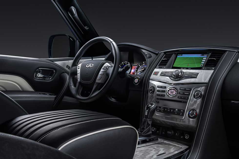The QX80 Limited is offered in five colors with the Anthracite Gray being an exclusive color for the Limited. The vehicle is available with seven-passenger seating including second-row captains chairs and a third-row bench. All seats have two-tone leather/Alcantara seats with contrast piping and stitching and quilting. Matte silver open-pore Ash wood trim is used along with leather wrapped grab handles.