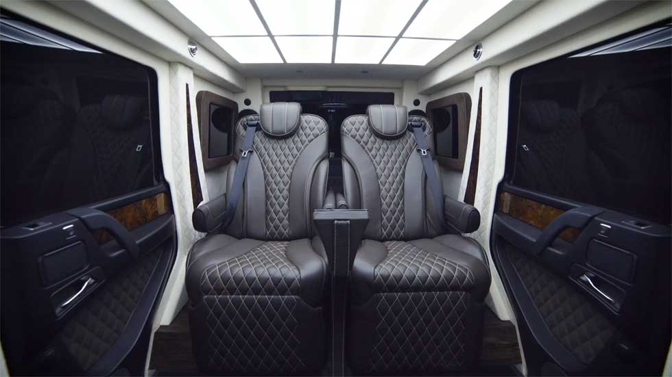 Inkas uses the old version of the G63, not the new one introduced this year for the ride. Those fancy reclining chairs are covered in Alcantara and leather. Inside that wood cabinetry under the TV is a motorized bar.