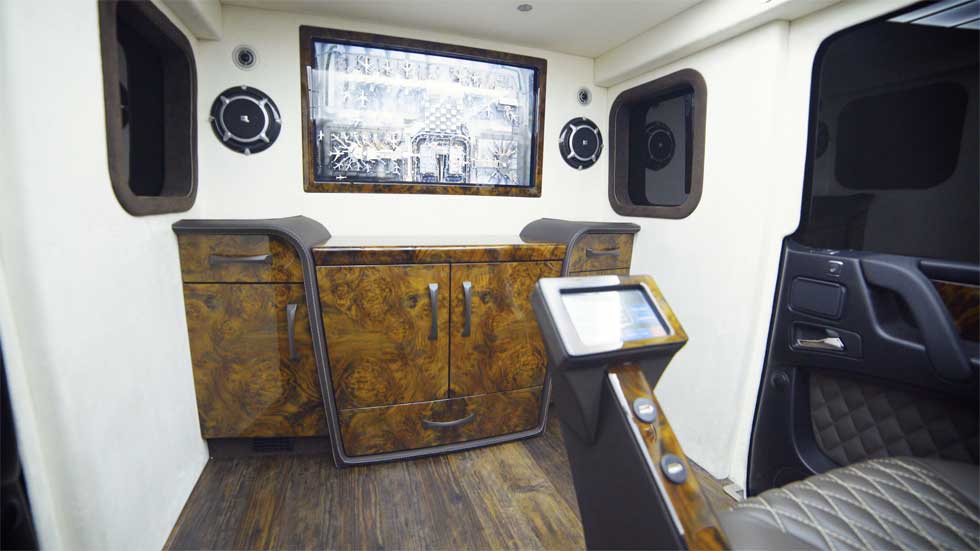 Overhead the brightly lit daylight headliner is meant to mimic real sunlight to help reduce fatigue and improve well-being. Other features include exterior surveillance systems, satellite tracking, run-flat tires, and flame-retardant coating on the exterior. The ride also has a fire suppression system. The price for all that security is $1.2 million.