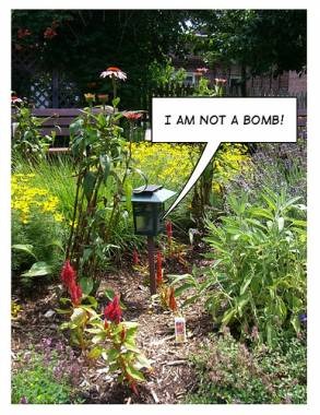 The handiwork of Sternlab's R. Stern and Rees Shad, the lamps are fashioned from standard solar-powered garden lights and are given flickering LEDs (to simulate fireflies) and the sentence "I am not a bomb" in twelve different languages. They're temperature controlled, speaking more frequently in warmer weather than cold.