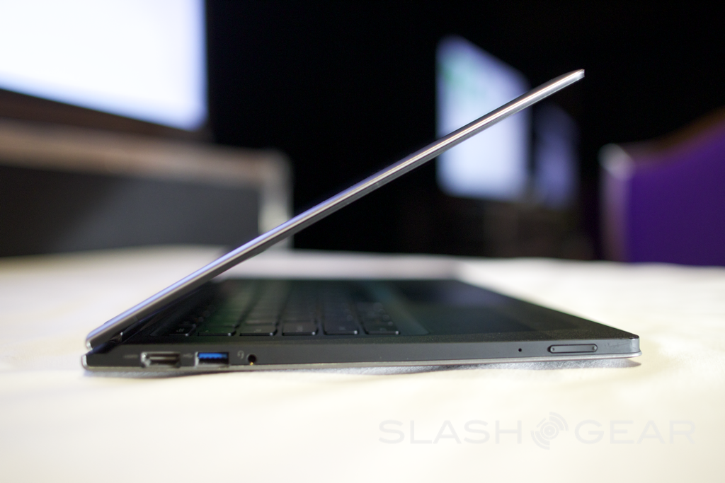 Controls for power and volume are located only on the book-style edge, making control in tablet mode possible. When the dual hinge goes past 180 degrees, the laptop keyboard (now facing down) is disabled. Standard Ultrabook internals power the Yoga, with Intel Core i3/i5/i7 and as much as 256GB of SSD storage.