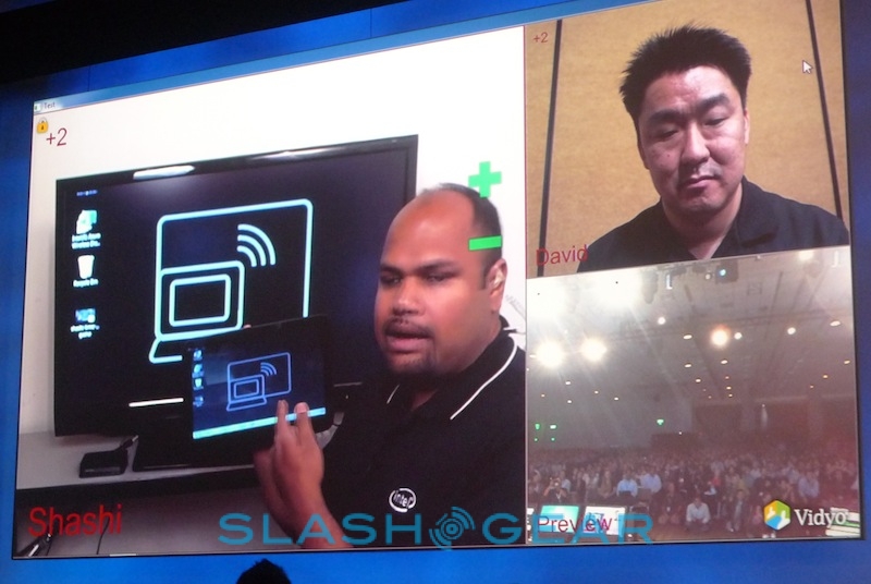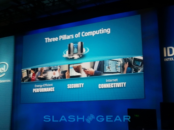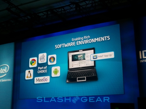 The company's WiDi or Wireless Display tech also got a name-check and an on-stage demonstration, with Intel showing a handheld tablet being used with WiDi to beam content onto a big-screen HDTV. Having acquired Infineon's wireless division, they also got a chance to namecheck the iPad among their "internet connectivity" push, while supported software environments included Linux, Google Chrome OS, Android, OS X, Windows and MeeGo.