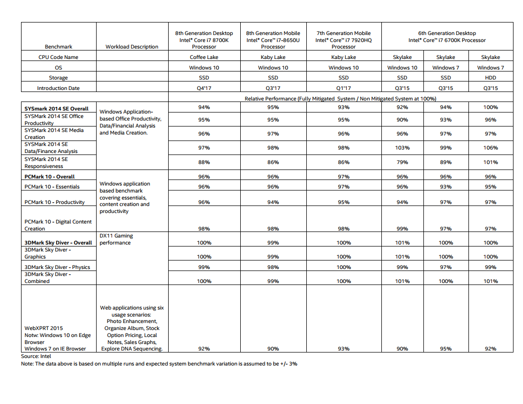 The first of those progress reports was released today. In a blog post to the Intel Newsroom, VP and general manager of Intel's Data Center Group Navin Shenoy shared benchmarks for Coffee Lake, Kaby Lake, and Skylake Core i7 processors running both Windows 10 and Windows 7 with SSD storage. The good news is that for things like business use and gaming, the performance hits are fairly small, with all CPUs operating at 90% relative performance or higher for tasks like media creation, data analysis, and office productivity.