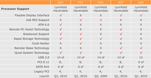 According to a chart complied by HKEPC Hardware, new chipsets will feature 14 USB 2.0 slots, 8 PCI-E x1 slots, 6 SATA ports with RAID features, and up to 4 legacy PCI slots. The exception is the entry-level H55 of up to 12 USB 2.0 and 6 PCI-E x1 slots. Additionally, videos connectivity is now natively supported HDMI, DVI, and DisplayPort.