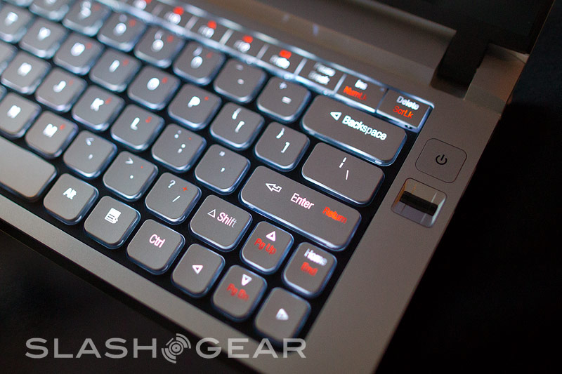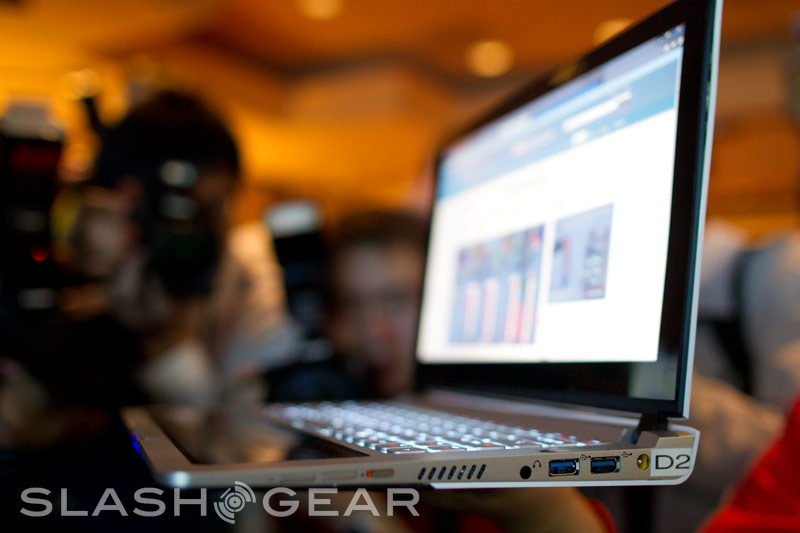The Windows 7-based (not Windows 8) hardware uses an almost entirely trasparent trackpad, running all along the bottom half of the ultrabook beneath the keyboard. When closed, you can see the window you were just using shrink to fit the now cropped area of the LCD. You can also activate a new touch-based interface that looks almost identical tro Windows 8 (but again, it isn't.) The trackpad itself is touch-senitive, making the entire unit transform into essentially a tablet with a huge bezel when closed. The top lid is also semi-transparent, but a representative told us that it was a manufacturing defect.
