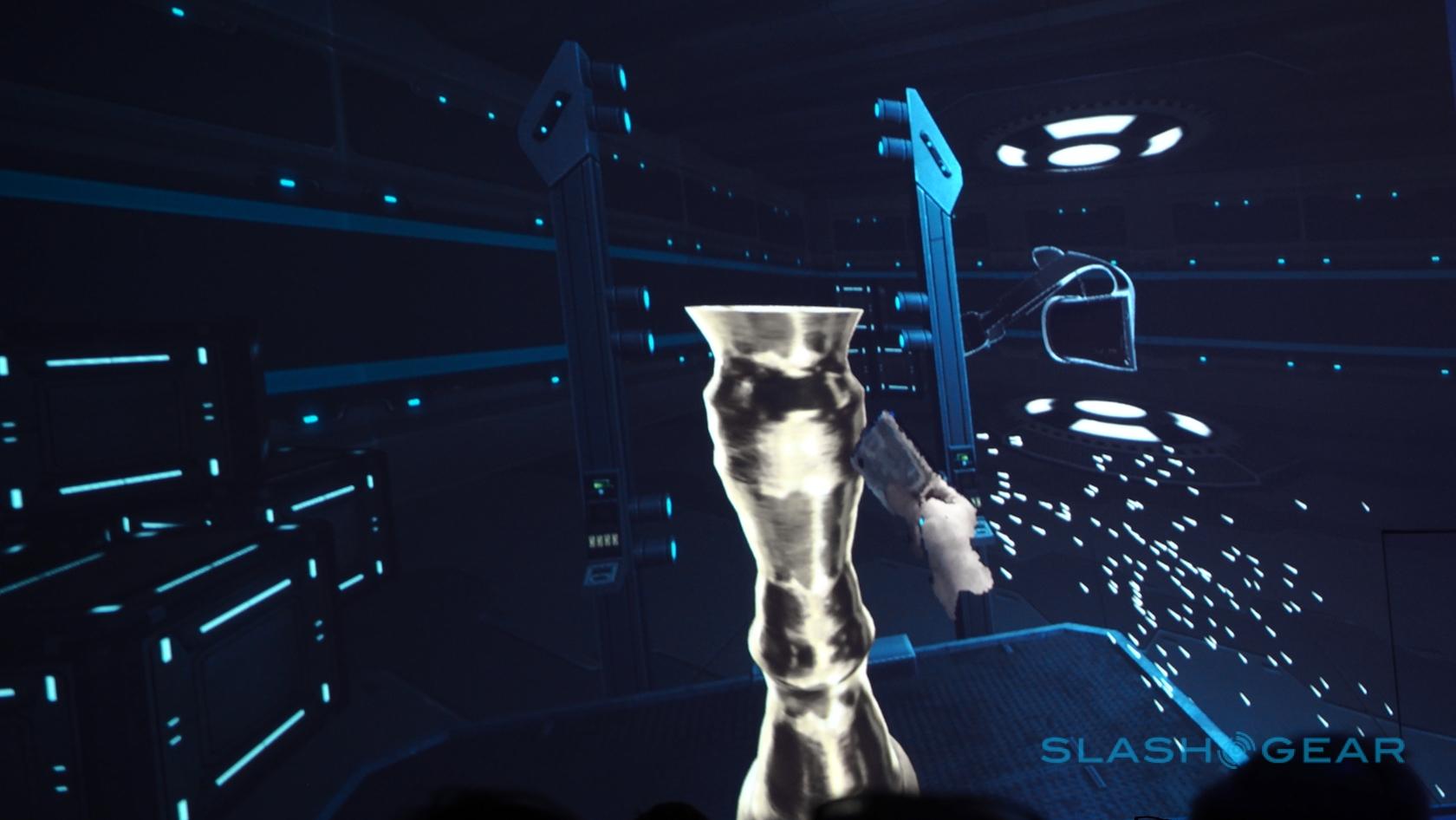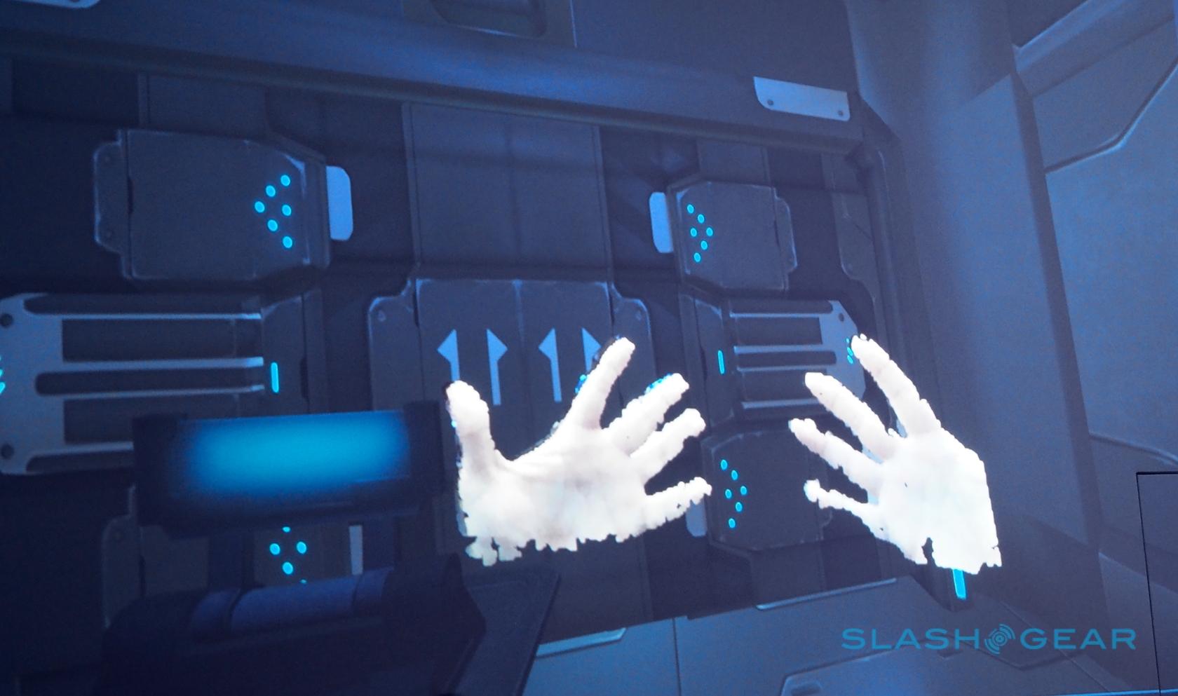 Rather than a gamepad controller, meanwhile, the RealSense camera is used for full depth sensing and real-time tracking of all five fingers on each hand. In fact, your hands show up as floating, disembodied limbs in the center of your view.