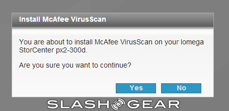 Configuring the device is done via a Web browser by going to "http://px2-300d." It's from here you can install various applications to the device via Application Manager and access the different features. One of the first things I installed was McAfee, a process as simple as clicking on the McAfee icon and verifying that I wanted to install it. Once installed, users can configure system events and schedule tasks, among other things; this provides real-time McAfee VirusScan Enterprise protection, and, according to Iomega, is the only NAS in its class that does so.