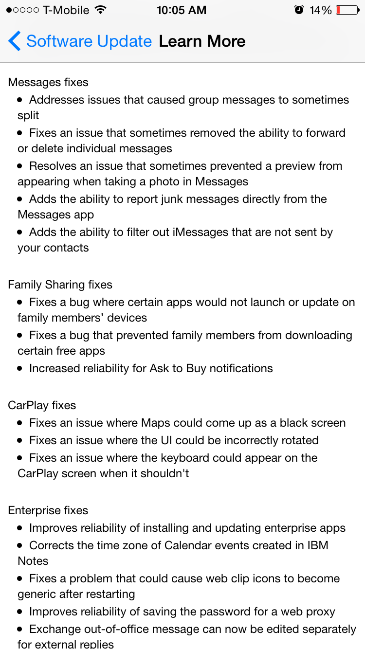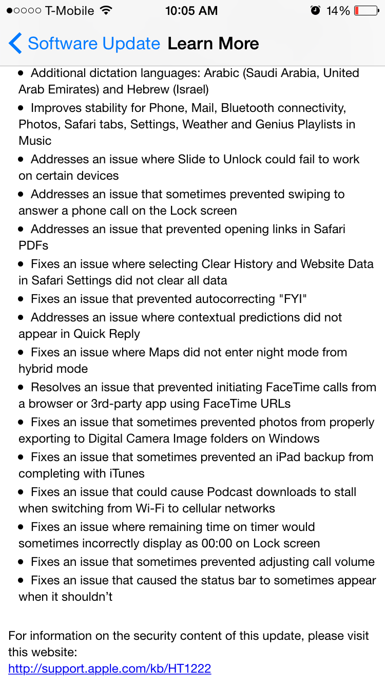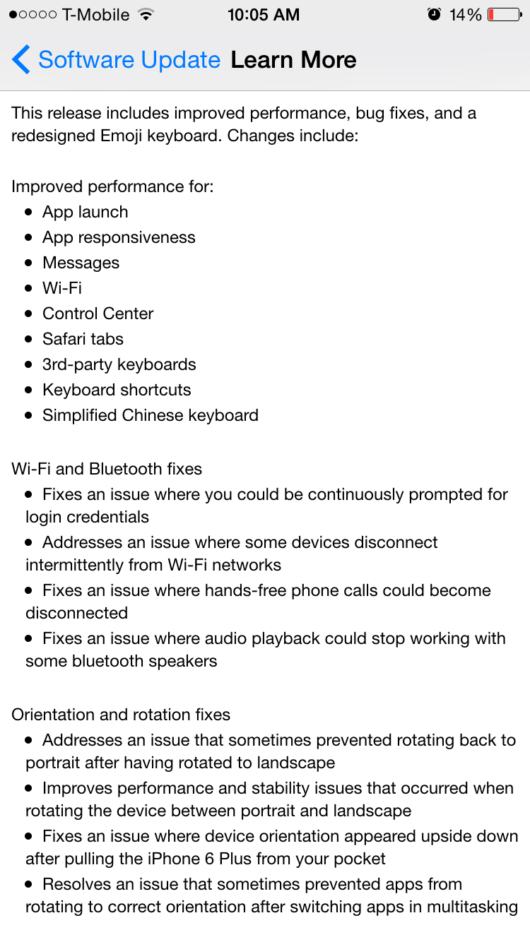 Some are device specific fixes, too — a problem Apple hasn't really had to deal with before the iPhone 6/6 Plus hit the scene. Apple fixed an issue where the screen orientation was upside-down when you pulled the iPhone 6 Plus from your pocket.
