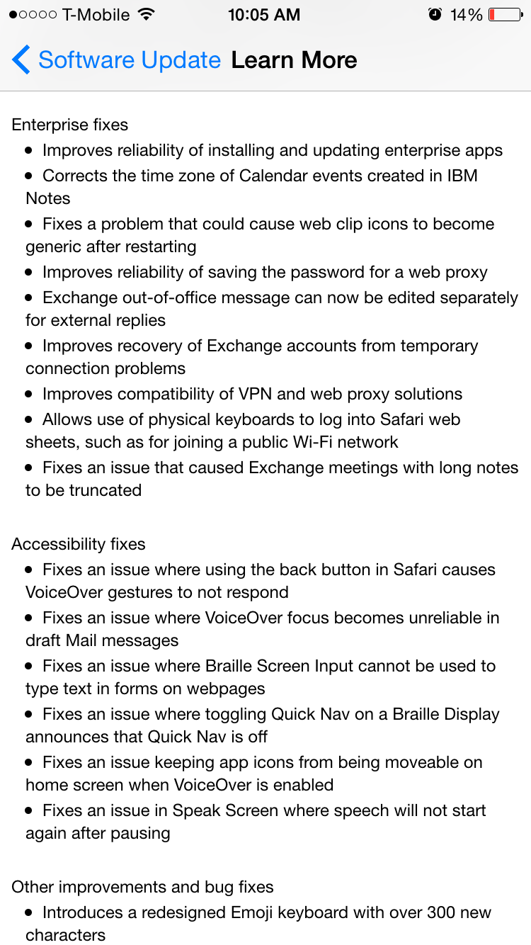 Apple also got tucked into the minutiae of updating iOS. Things as slight as an autocorrection for "FYI" or trouble adjusting call volume have even been addressed.