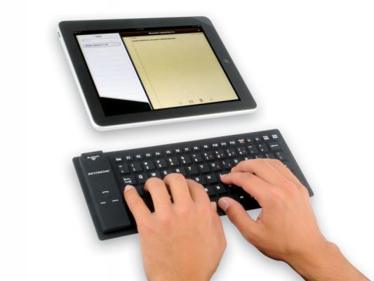 The $59.99 Scosche freeKEY is a water resistant, Bluetooth keyboard, perfect for working on the go. The rugged, high quality silicone keyboard has a wireless range of up to 30 feet, a retractable USB cable for charging, and rolls up for easy storage.
