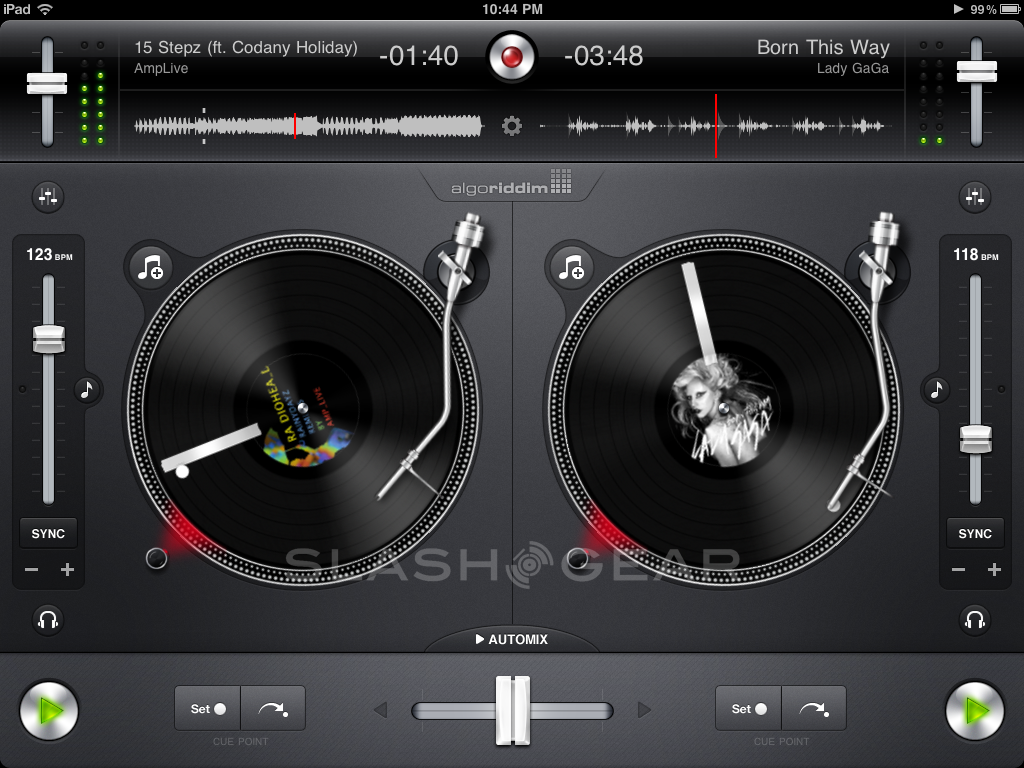 Now I'm not going to get too extremely in-depth with this app because while it's created with the ability to tend to even the most high-class and skilled DJ folk on the block, it's made simple enough for essentially any halfways intelligent and/or musically inclined humanoid to use with ease. Flip back and forth between tracks, speed up or slow down tracks, and turn up or down the tracks as you see fit. Add tracks automatically from a list or add them manually to either side as you need. You'll be able to see the music levels above the records on either side to see how far you are in the track, and you'll be able to mark any moment in the track with a pin then get back to that pin at the press of a button (these are the two buttons below the digital vinyl.) Album covers are displayed in the vinyl disks as well – it's all pretty or totally nasty depending on your own collection of tunes.