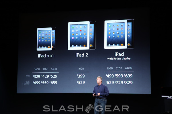 The 32GB WiFi-only iPad mini will be $429, while its WiFi + Cellular cousin will be $559. Finally, the 64GB iPad mini will be $529 for the WiFi-only model, and $659 for the WiFi + Cellular. The iPad 2 will remain on sale, priced at $399 for the WiFi-only 16GB, and $529 for the 16GB WiFi + Cellular.