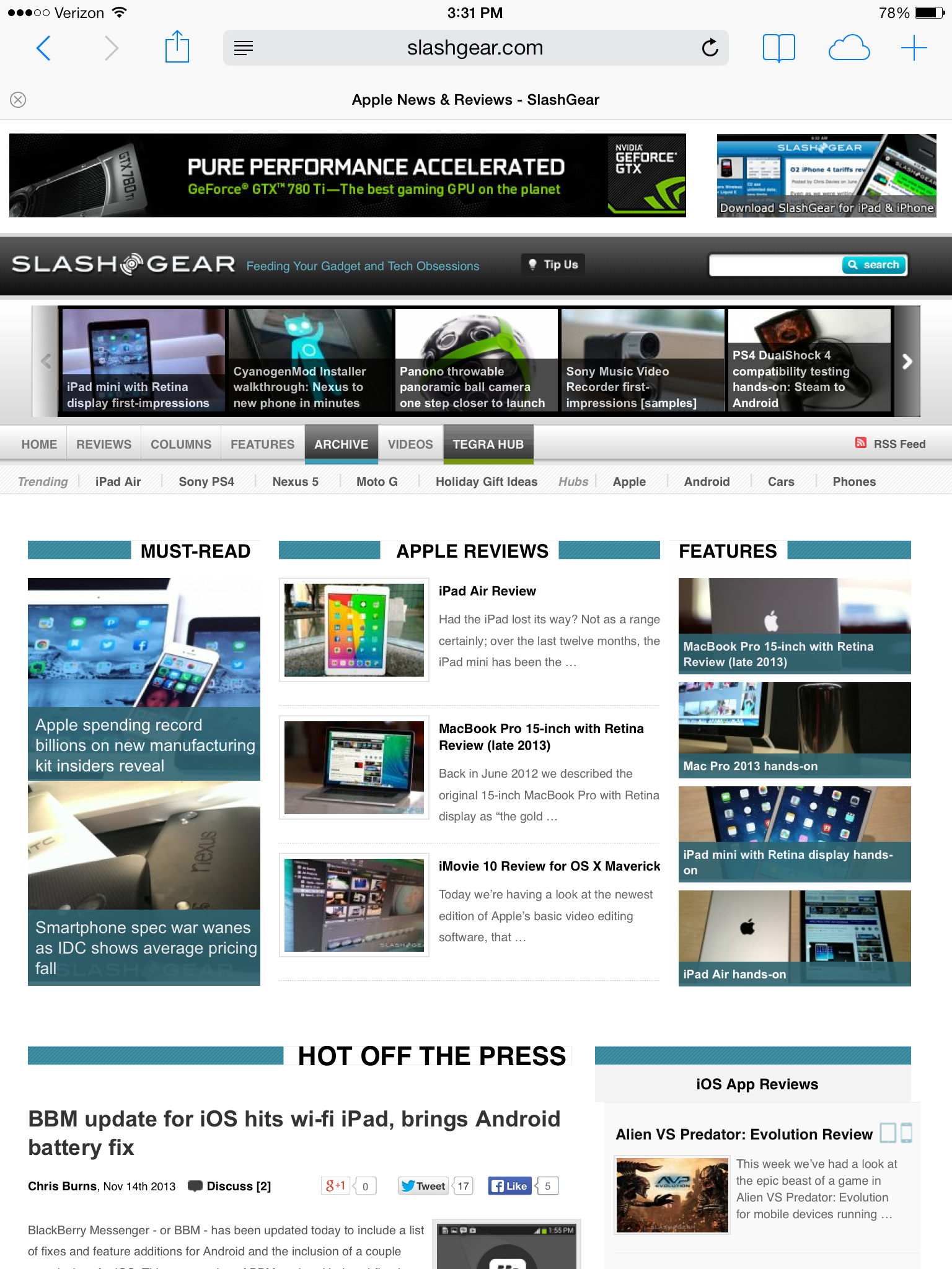 There are some notable improvements along the way, however. The Retina version has twice the RAM of its predecessor, which means multitasking – which looks far better than in iOS 6, with useful previews of the apps you can switch to – is faster as the iPad can keep more in its memory at one time. Similarly, where we've encountered crashes in Safari on the iPad mini as hefty webpages suck up all the spare resources, that simply didn't happen in the same way on the second-gen model.