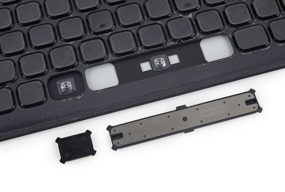 After prying off the plastic layer, iFixit notes how the thin keycaps simply pop out. Underneath is a circuit board with 64 dome switches, and little else except for channels that lead to small vents believed to let air escape each time a key is pressed. Finally, at the end, they reveal three fabric strips which serve to connect the keyboard to the Smart Connector and allow two-way power and data.